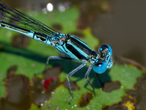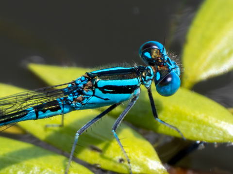 オスは全体に明るい青が目立ち、特に複眼の青はとても鮮やかです。